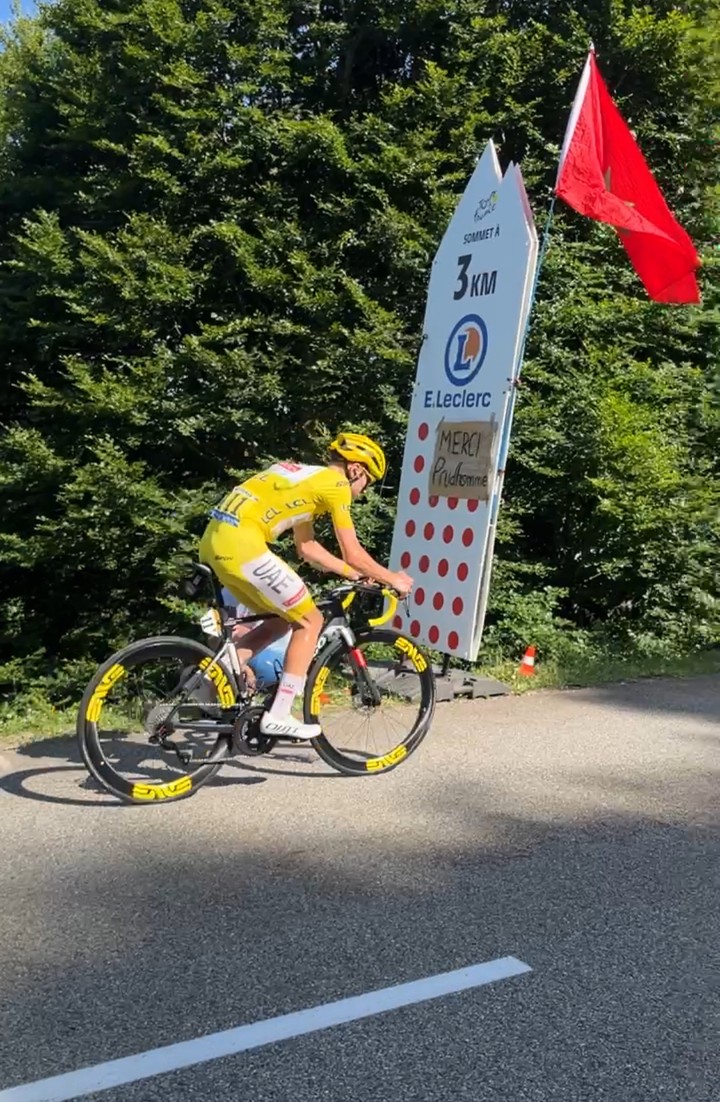 Y en un abrir y cerrar de ojos pasó aquel maillot amarillo que parecía volar. Fue un verdadero lujo presenciar esa fuga del gran Pogačar. Y claro, los otros ciclistas también dieron mucho de qué hablar. Aparte de asombrarme al ver su alta cadencia, me disfruté mucho viendo sus expresiones. Algunos estaban casi desfigurados. No es para menos, esa etapa estuvo macabra. Luego tocó bajar ese puerto de montaña con miles de personas, eso da mucho estrés pues el riesgo de caídas es alto. ¡Además de que no contaba con que bajaría con los pros! Mientras descendía, escuchaba el sonido que desprendía la velocidad con la que lo hacían. ¡Wao!
